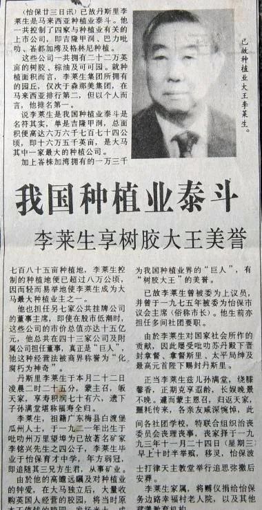 李莱生(1921-1992),怡保万里望人,1950年代开始涉足种植业。1970年代,马来西亚的树胶产量位居世界第一,而李莱生辖下的产量位居国内第一,因而获得“橡胶大王”的称号。他一手创办吉隆坡甲洞集团,并将其发展为集种植、贸易和房地产等多元产业于一体的综合型企业集团,旗下共有四家与种植业相关的上市公司。