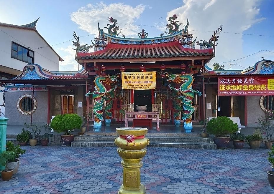 双文丹福灵宫由当地福建社群创立,位于新建福建会馆后方,始建于 1869 年,供奉神祇灵验而得名。庙宇早期建于河边,光绪初年迁至现址,以木料搭建,未用铁钉,现今古色古香,庄严华丽。相传孙中山早期赴马来西亚号召华人抗争打仗时曾在福灵宫逗留。