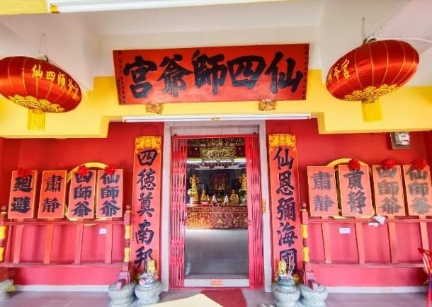 仙四师爷宫由广东人创办,位于福灵宫后方,始建于 1861 年,供奉甲必丹盛明利(仙师爷)和钟炳来(四师爷)。庙宇建成后延续信仰与联络乡情。每年大年初一陆佑、初二冯华前来上头柱香,体现其影响力。